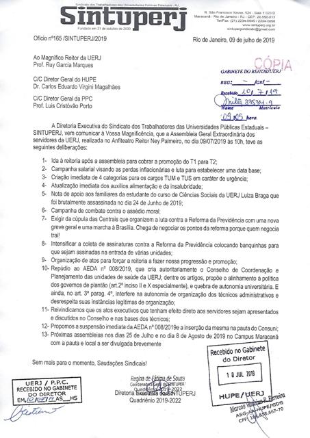 Deliberações da Assembleia Geral Extraordinária dos servidores técnico-administrativos da Uerj realizada no dia 09/07/2019.
