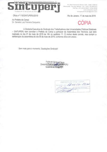 O Sintuperj encaminhou na manhã desta sexta-feira, 17/05, ofício à Prefeitura do campus Maracanã da Uerj com o objetivo de convidar o atual prefeito do campus, Sr. Geraldo Luiz Cerqueira Ferreira, a participar da próxima assembleia Geral Extraordinária da categoria, que está prevista para o dia 21/05, no auditório 11.