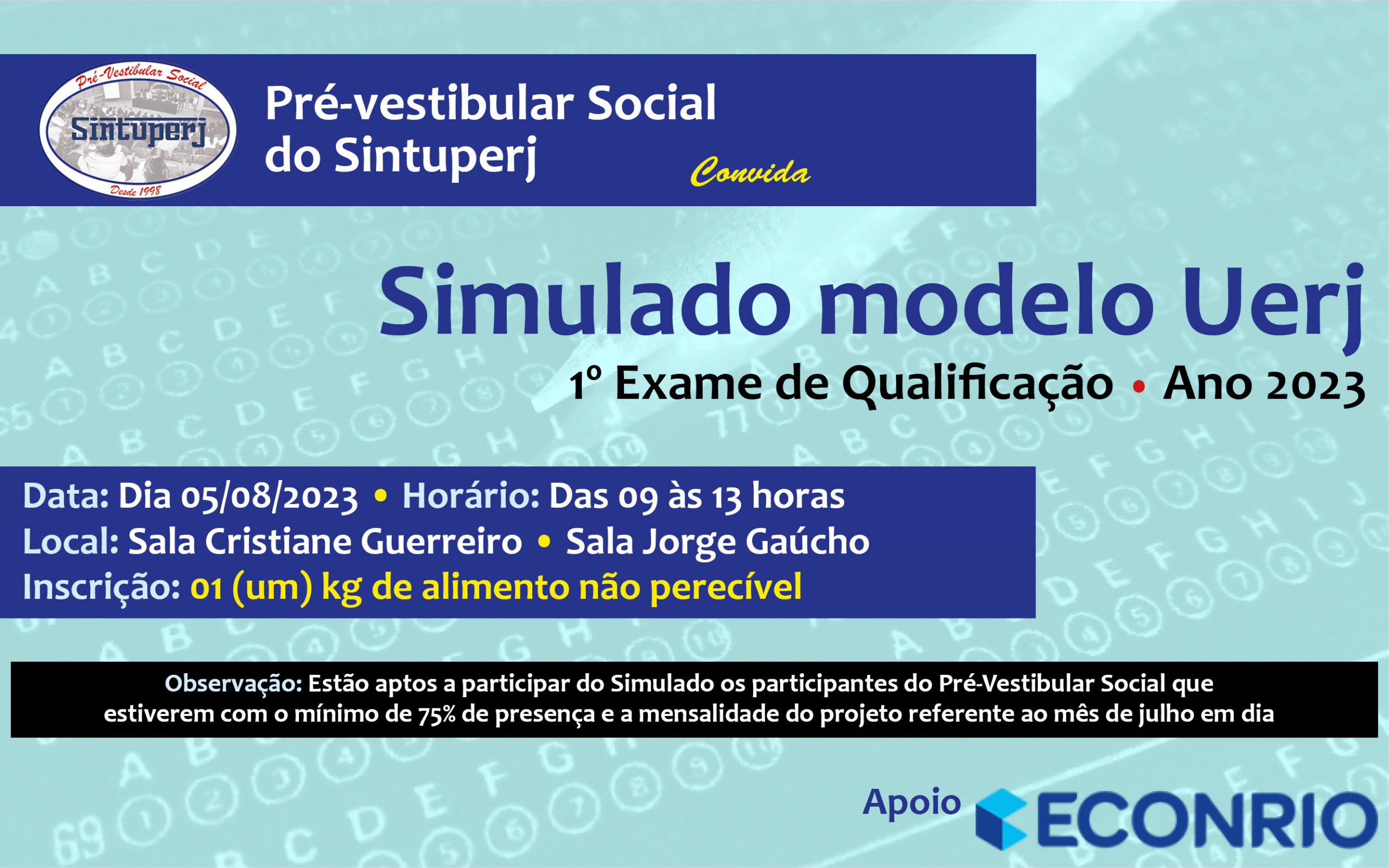 No próximo sábado (05/08), o Pré-vestibular Social do Sintuperj realizará mais um simulado em 2023. Será a partir das 9h, nas salas Cristiane Guerreiro e Jorge Gaúcho. A inscrição será feita mediante 1 kg de alimento não perecível.