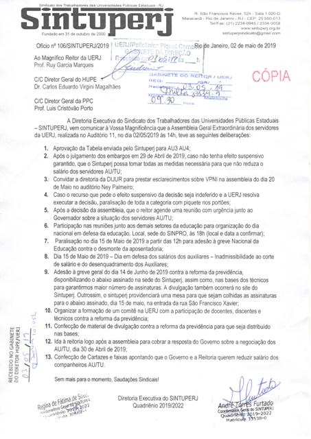 Ofício 106 – Deliberações da Assembleia de 02.05.2019
