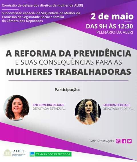Os efeitos da Reforma da Previdência sobre as mulheres será tema de um debate da Comissão de Defesa dos Direitos da Mulher da Alerj, na próxima quinta-feira (02/05), das 9h às 12:30, no Plenário da Alerj. Os debates contarão com as presenças da deputada federal Jandira Feghali (PCdoB) e da deputada estadual Enfermeira Rejane (PCdoB).