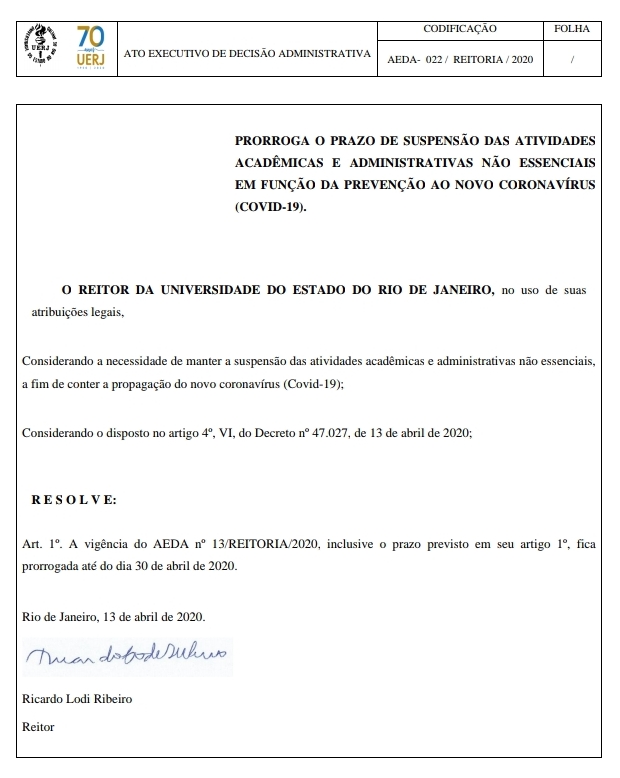 Após o anúncio pelo Governo do Estado do Rio de Janeiro de prorrogar pela segunda vez o período de quarentena, a Uerj publicou Ato Executivo de Decisão Administrativa (Aeda 022/2020) estendendo o período de quarentena até o dia 30 de abril. Confira o anúncio oficial abaixo: