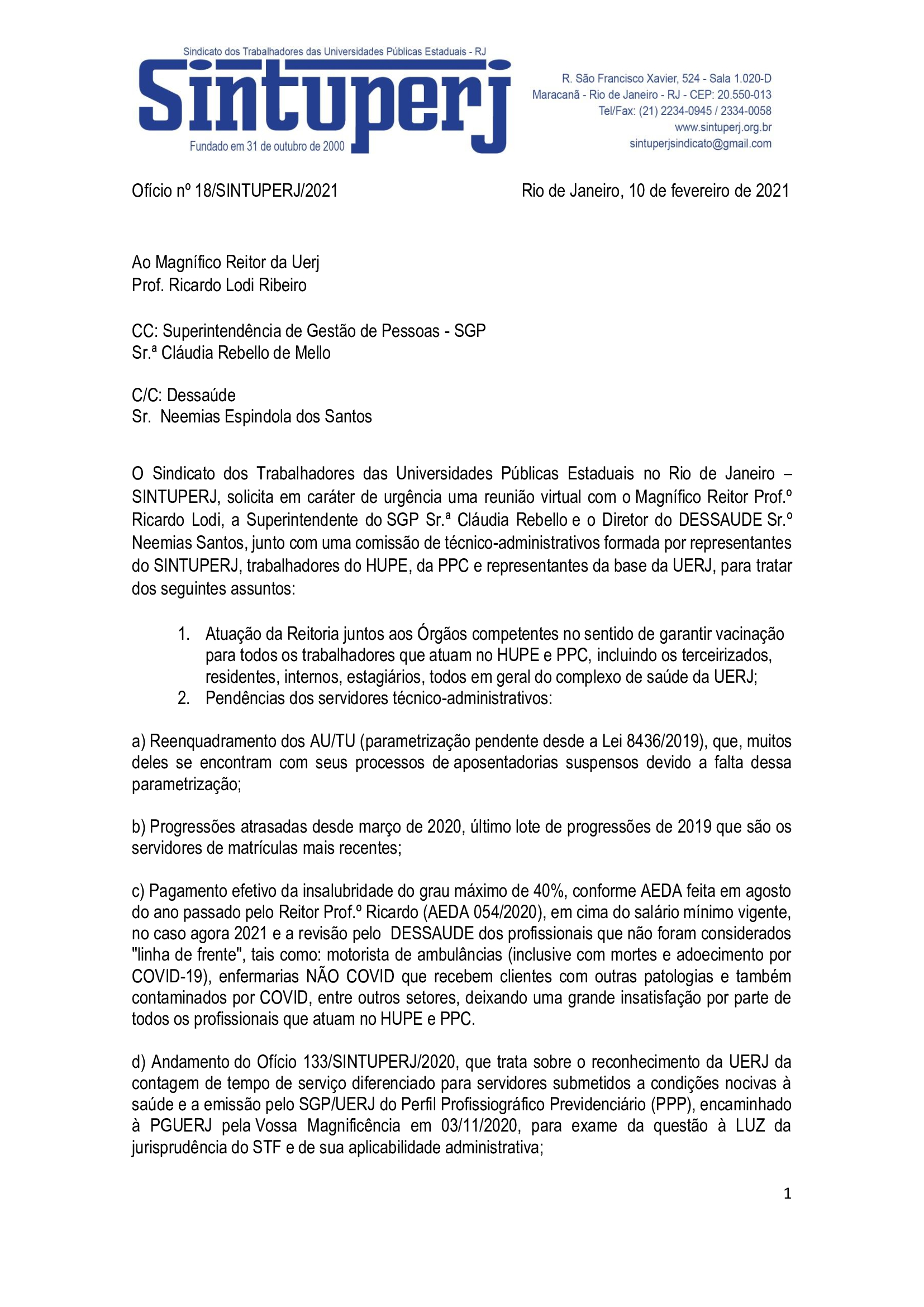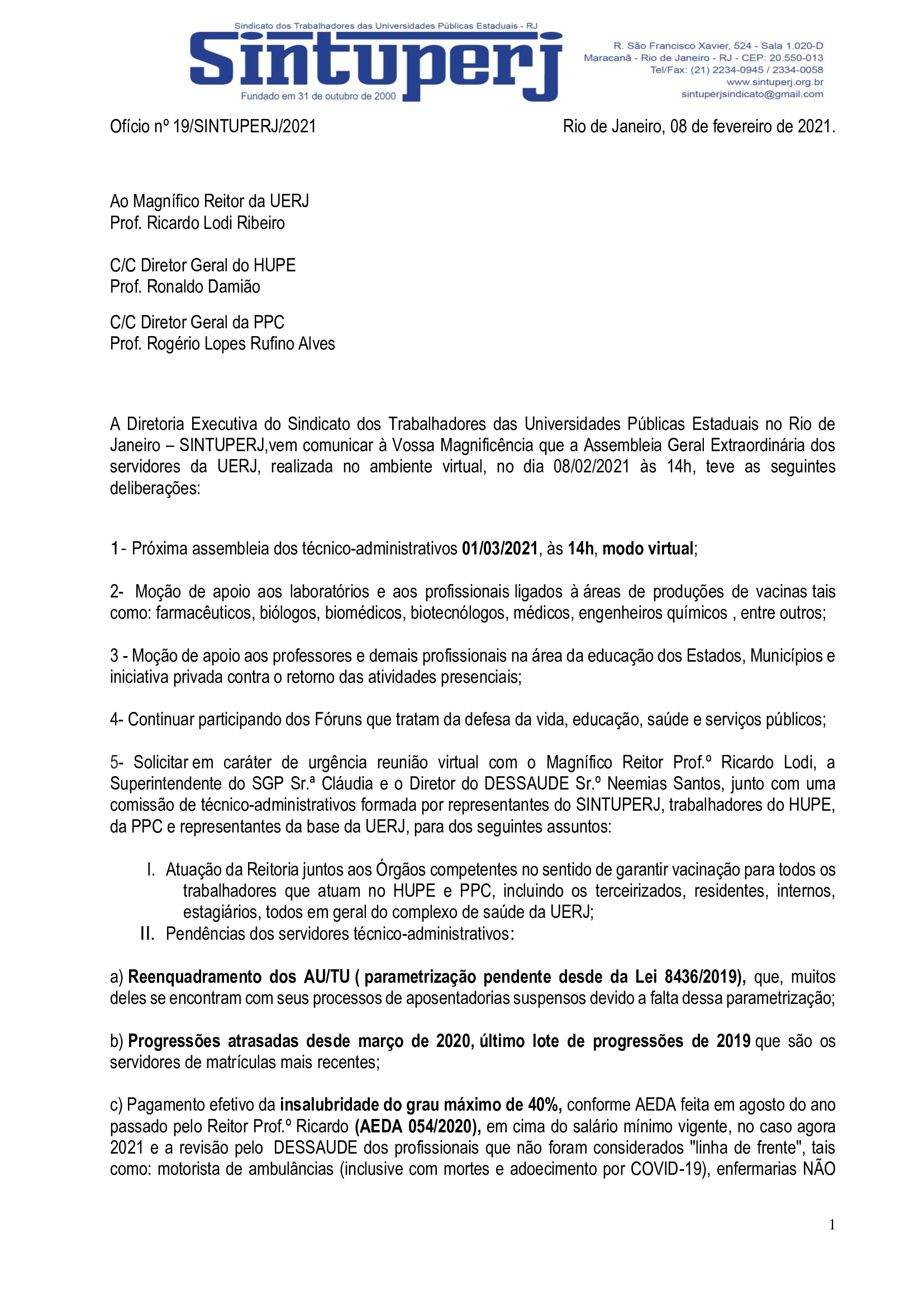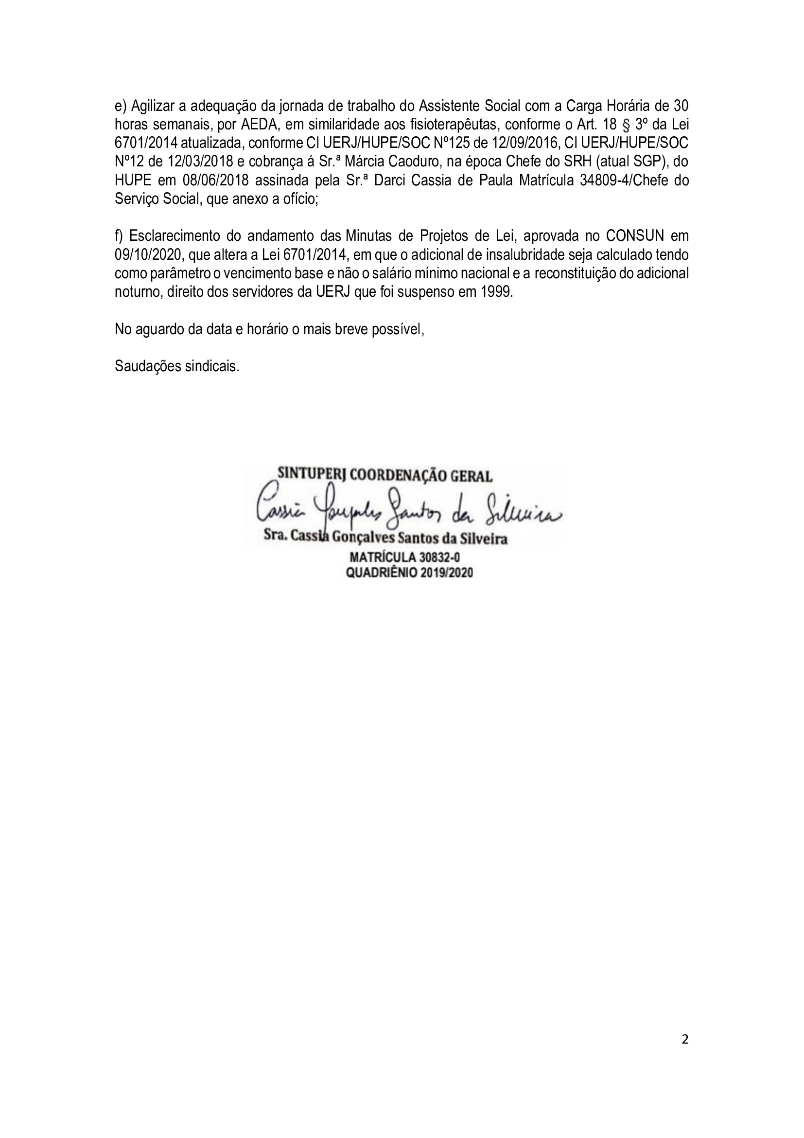 Por fim, a coordenadora ainda ressaltou que pela manhã havia solicitado à Reitoria a realização de uma reunião virtual com a presença do Sintuperj, de representantes da base da categoria, da Superintendência de Gestão de Pessoas para tratar das diversas demandas apresentadas.