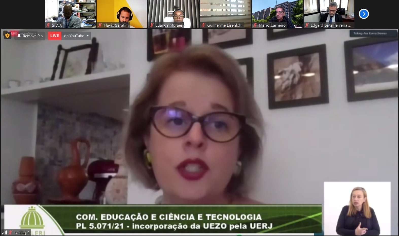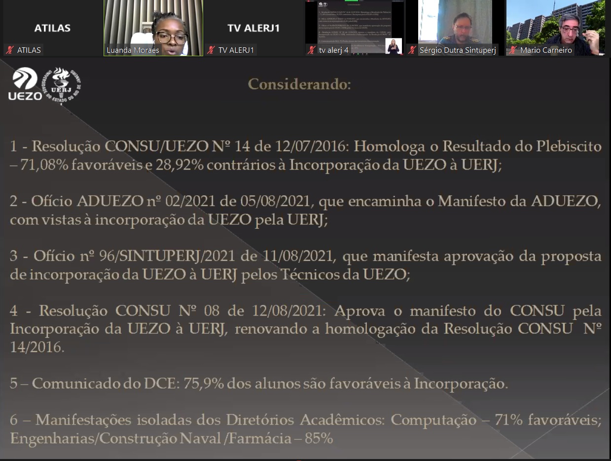 A coordenadora geral do Sintuperj Cássia Gonçalves destacou que o sindicato não poderia deixar de apoiar o clamor dos técnico-administrativos da Uezo que, em assembleia, deliberou pela incorporação como última tentativa de não sucumbir. Ela agradeceu os trabalhos dos parlamentares que buscam melhorar o projeto, mas elencou algumas emendas que ela classificou como prejudiciais solicitando a supressão destas. Entre elas, a que reduz direitos, a que prevê a volta imediata das aulas em meio à pandemia e a que prevê privatização. Ela fez um apelo para que nenhum direito seja extinto.