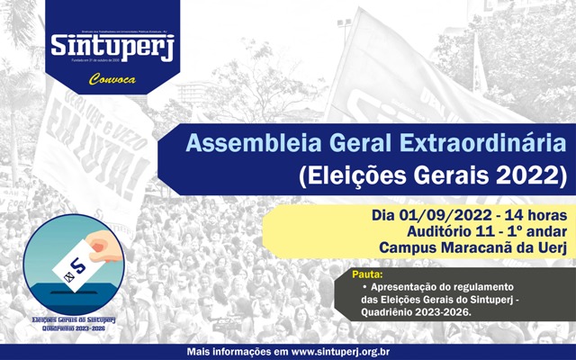 Destaque SINTUPERJ CONVOCA: Assembleia Geral Extraordinária – Eleições Gerais 2022. Dia 01/09, às 14hDiedro Barros26 de agosto de 2022