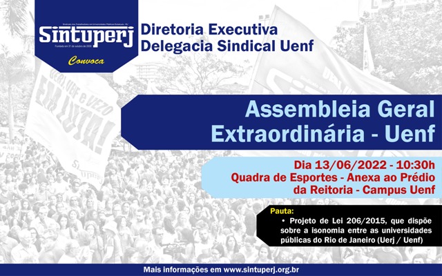 Destaque SINTUPERJ CONVOCA: Assembleia Geral Extraordinária Uenf – Presencial. Dia 13/06, às 10:30hDiedro Barros10 de junho de 2022