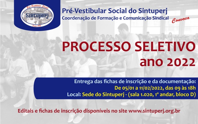 Destaque Pré-Vestibular Social do Sintuperj abre processo de seleção para vagas do ano de 2022Diedro Barros5 de janeiro de 2022