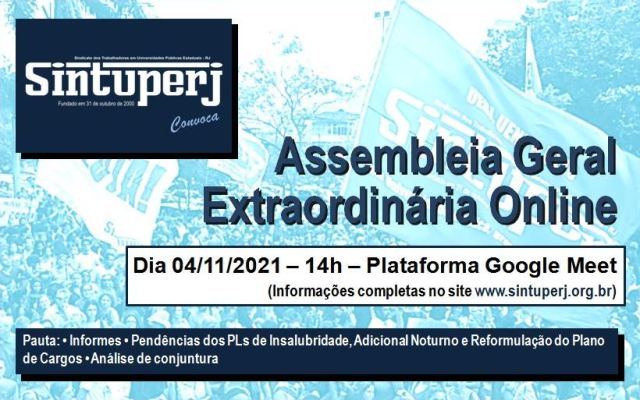 Destaque SINTUPERJ CONVOCA: Assembleia Geral Extraordinária Online. Dia 04/11, às 14 horasDiedro Barros31 de outubro de 2021
