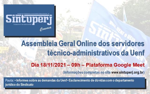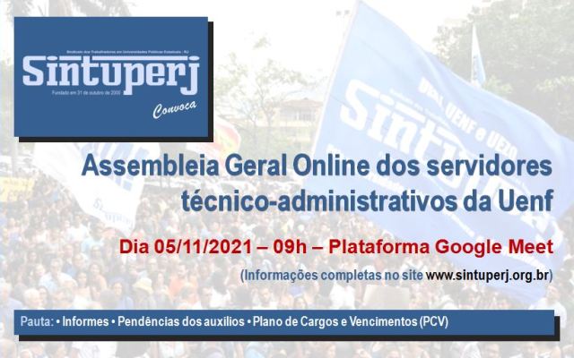 Destaque SINTUPERJ CONVOCA: Assembleia Geral Online dos servidores técnico-administrativos da Uenf. Dia 05/11, às 09 horasDiedro Barros1 de novembro de 2021