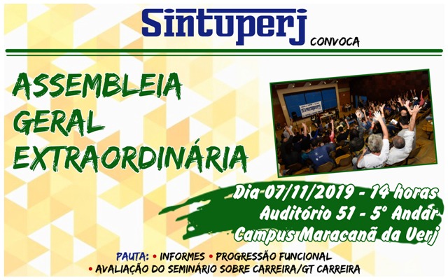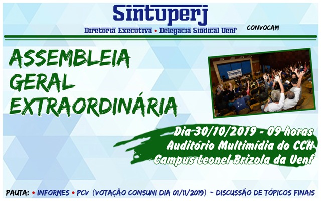 Destaque SINTUPERJ CONVOCA: Assembleia Geral Extraordinária na Uerj. Dia 07/11, às 14hDiedro Barros31 de outubro de 2019