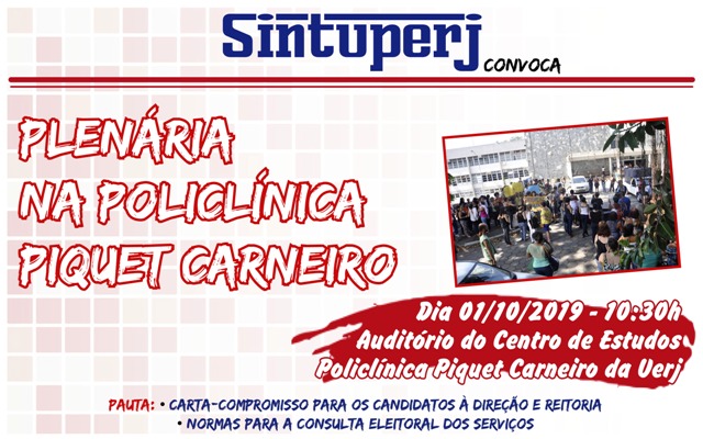 Destaque SINTUPERJ CONVOCA: Plenária na Policlínica Piquet Carneiro. Dia 01/10, às 10:30hDiedro Barros26 de setembro de 2019