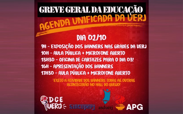 Destaque SINTUPERJ, DCE-UERJ, ASDUERJ E APG CONVOCAM: Atividades de mobilização para a Greve Geral da Educação – Dia 02/10Diedro Barros1 de outubro de 2019