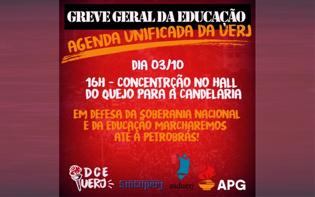 Destaque SINTUPERJ, DCE-UERJ, ASDUERJ E APG CONVOCAM: Greve Geral da Educação – Ato em defesa da Soberania Nacional e da Educação – Dia 03/10, às 16hDiedro Barros1 de outubro de 2019