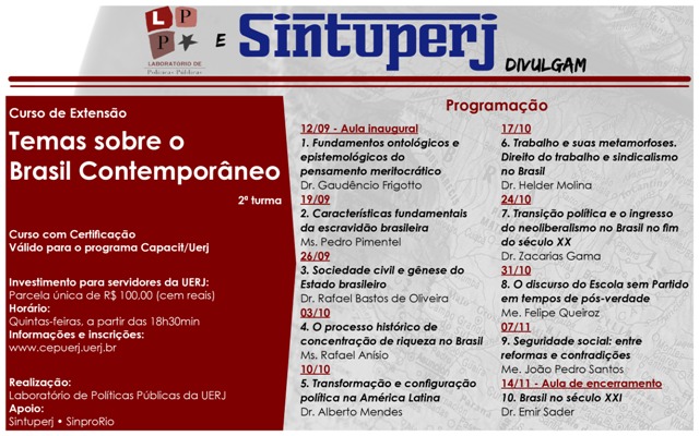 Destaque LPP-Uerj e Sintuperj promovem curso Temas sobre o Brasil ContemporâneoDiedro Barros10 de setembro de 2019