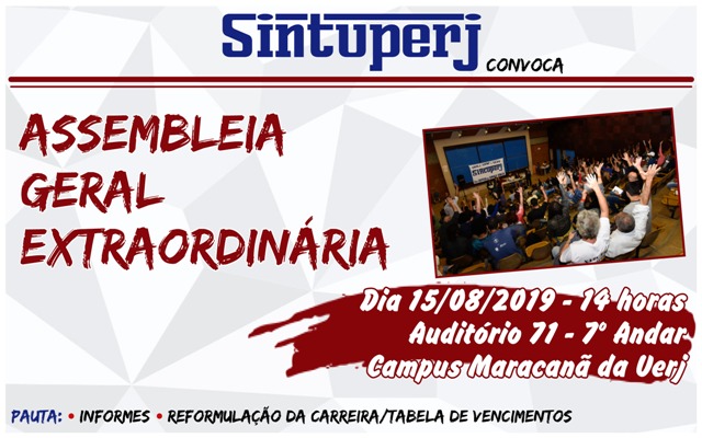 Destaque SINTUPERJ CONVOCA: Assembleia Geral Extraordinária na Uerj. Dia 15/08, às 14hDiedro Barros9 de agosto de 2019