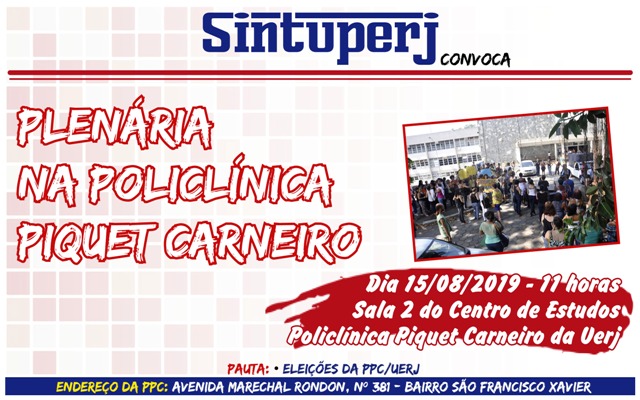 Destaque SINTUPERJ CONVOCA: Plenária na Policlínica Piquet Carneiro. Dia 15/08, às 11hDiedro Barros9 de agosto de 2019