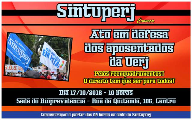 Destaque SINTUPERJ CONVOCA: Ato no Rioprevidência em defesa dos aposentados da Uerj – Dia 17/10, às 10hDiedro Barros8 de outubro de 2018