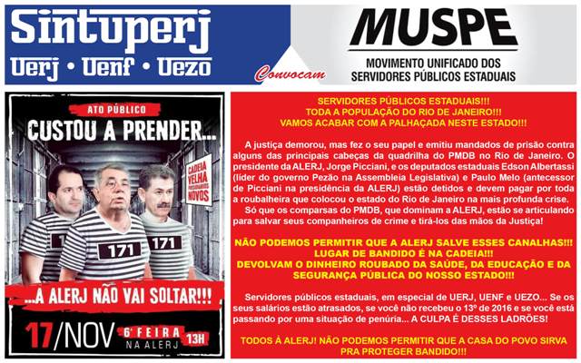 Sem categoria Muspe e Sintuperj convocam: Custou a prender… A Alerj não vai soltar!Diedro Barros17 de novembro de 2017