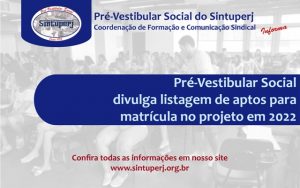 Tem início nesta quarta-feira, 05/01/2022, o processo de seleção para as vagas do ano de 2022 do Pré-Vestibular Social do Sintuperj. Ao todo serão disponibilizadas 200 (duzentas) vagas, sendo 100 (cem) para o turno da tarde (das 14 às 17…