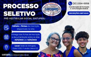 Tem início nesta segunda-feira, dia 21/11, o processo de seleção para as vagas do ano de 2023 do Pré-Vestibular Social do Sintuperj. Ao todo serão disponibilizadas 300 (trezentas) vagas, sendo 150 (cento e cinquenta) para o turno da tarde (das…
