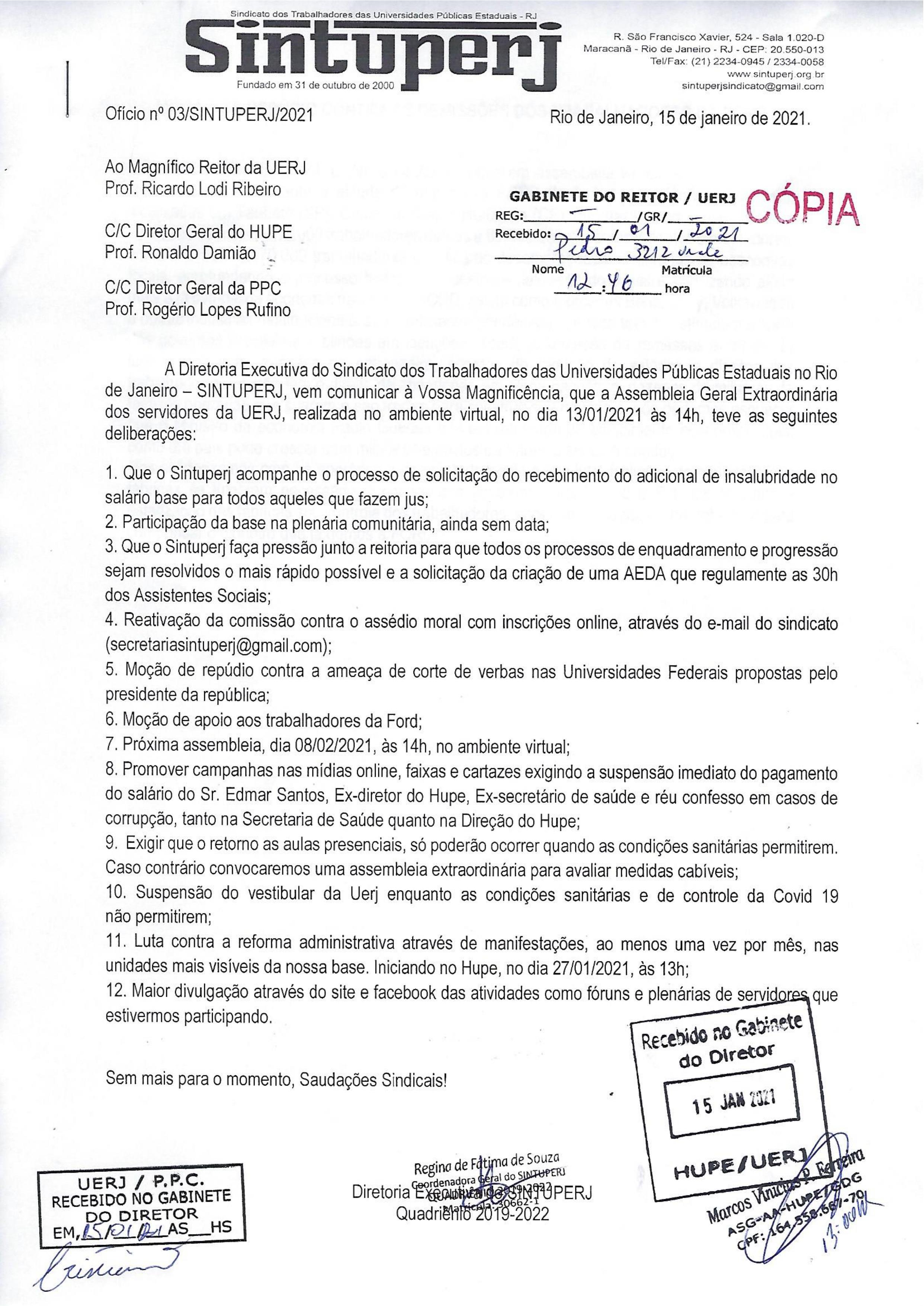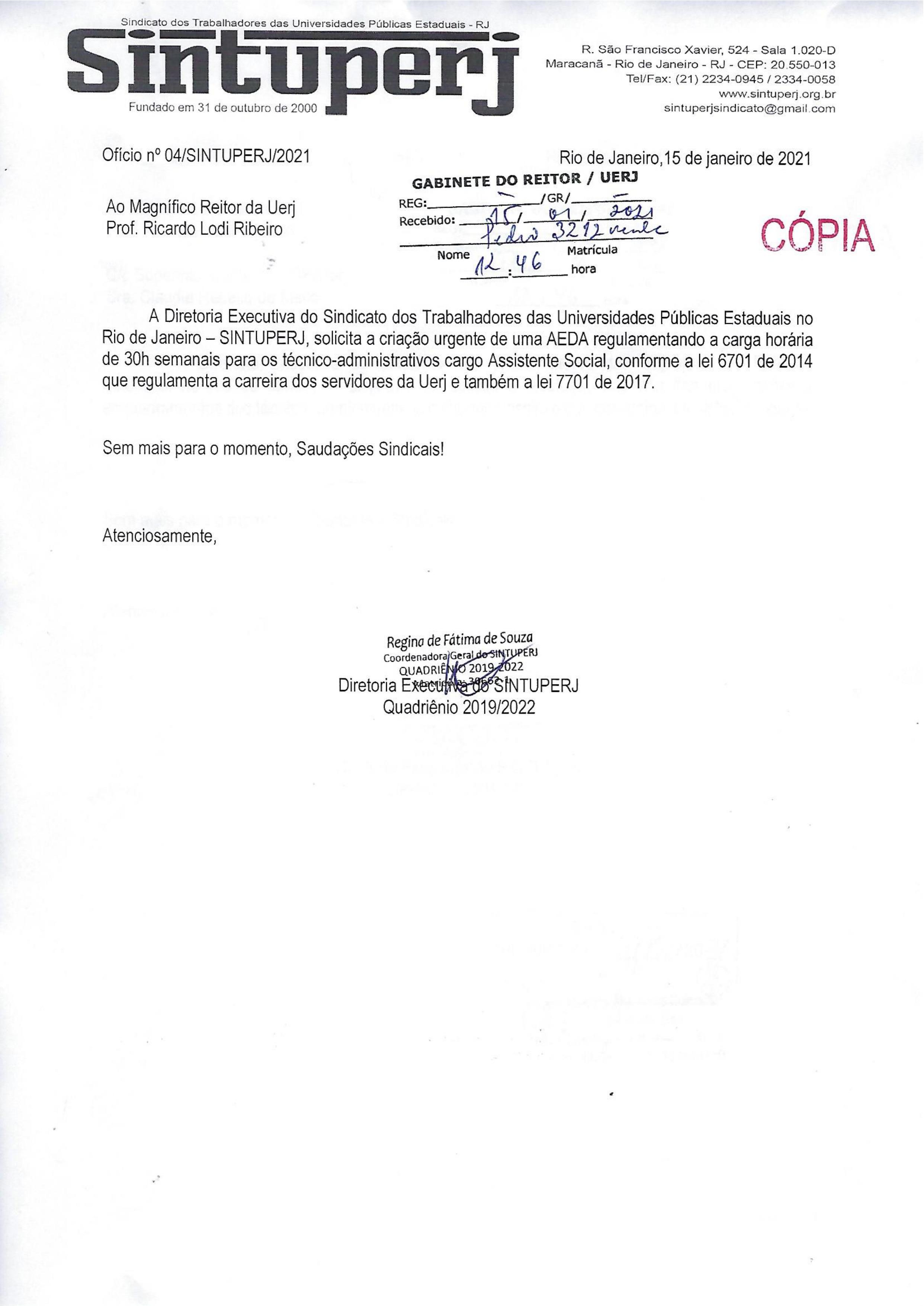 Sobre o retorno das atividades presenciais no Sintuperj, a direção esclareceu que a sede do sindicato não pôde ser reaberta para atendimento devido à prorrogação do Ato Executivo de decisão Administrativa que estabeleceu trabalho remoto na universidade. Desta forma, somente a delegacia do Sintuperj no Hospital Universitário Pedro Ernesto (Hupe) reabriu já que os profissionais de saúde do hospital continuaram a desempenhar suas funções de forma presencial.