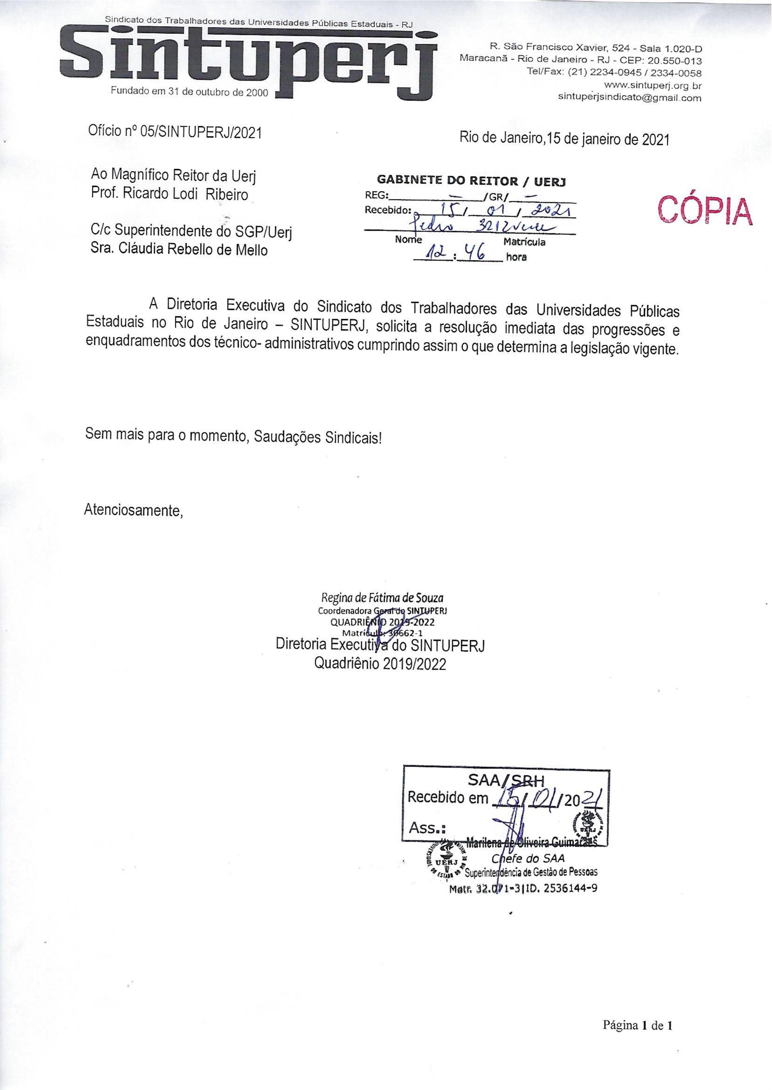 A coordenadora geral do Sintuperj Cassia Gonçalves relatou que a direção do sindicato tem mantido diálogo constante com a Administração Central Uerj. Um dos temas abordados foi sobre o pagamento do último grupo de servidores referente à progressão na carreira, que deveria ter ocorrido em março de 2020. De acordo com Cassia, a Administração da Uerj afirmou que os reenquadramentos pendentes devem ocorrer em março ou abril próximo. Além disso, sobre a progressão prevista para 2021, não deverá haver a exigência de realização de cursos pelos servidores já que a Uerj não os disponibilizou.