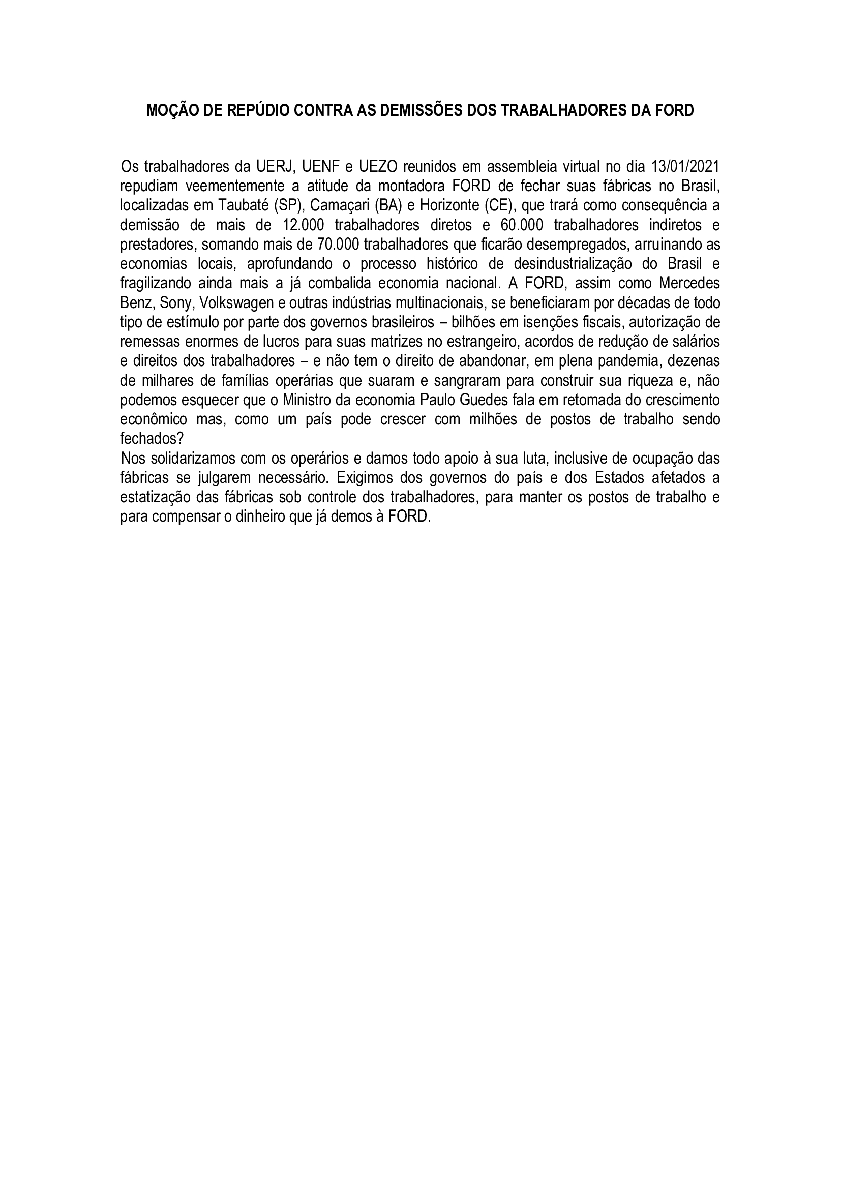 Moção de repúdio contra demissões de trabalhadores da Ford: