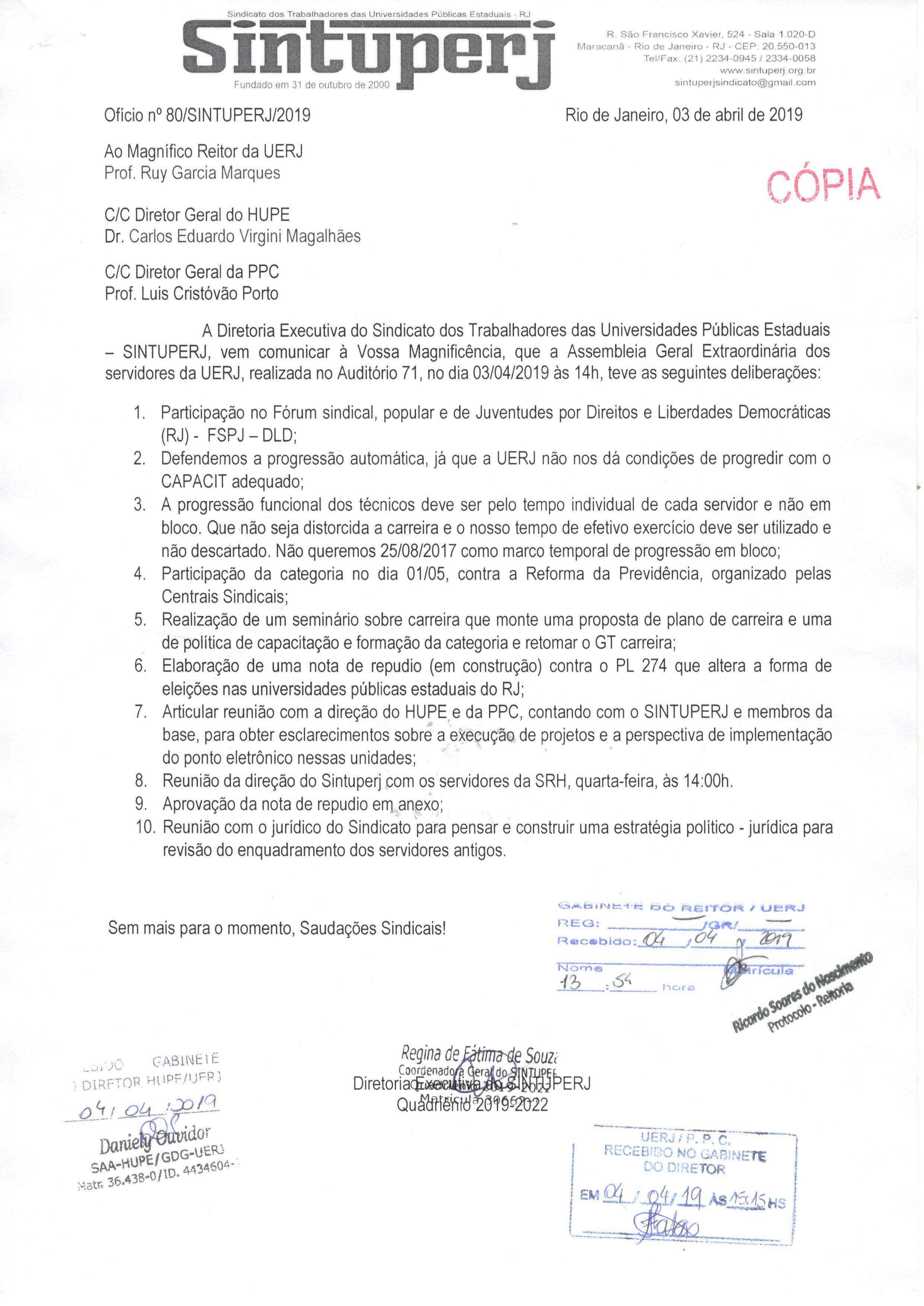 Ofício 080 – Deliberações da Assembleia de 03.04.19