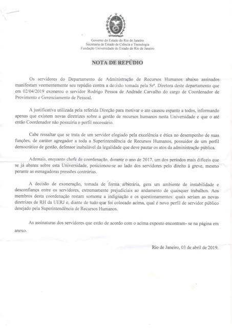 Os servidores do Departamento de Administração de Recursos Humano abaixo assinados manifestam veementemente seu repúdio contra a decisão tomada pela Srª. Diretora deste departamento que em 02/04/2019 exonerou o servidor Rodrigo Pessoa Carvalho de Andrade do cargo de Coordenador de Provimento e Gerenciamento de Pessoal.