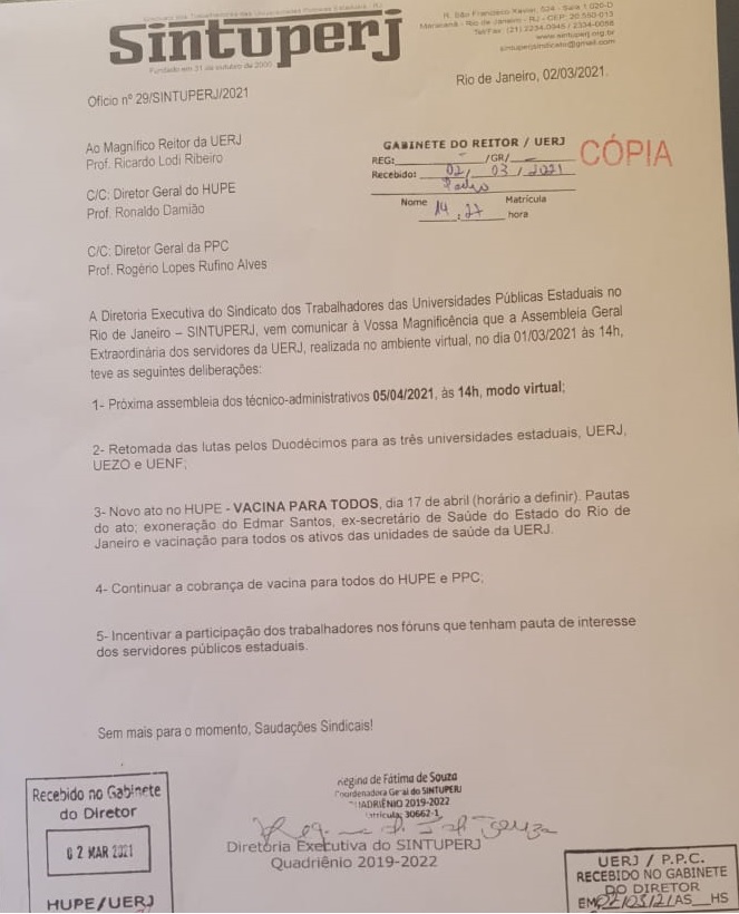 Durante a assembleia virtual realizada na última segunda-feira (01/03), a Coordenação Executiva do Sintuperj trouxe diversos informes sobre as reivindicações de sua base. Entre eles, estiveram as demandas debatidas pela direção do sindicato com a Reitoria da Uerj em reunião realizada no último dia 25 de fevereiro. A primeira delas, como não poderia deixar de ser, foi a cobrança pela ampla vacinação dos servidores da Uerj que trabalham nas áreas da Saúde. Nesse sentido, foi informado pelo reitor da Uerj, Ricardo Lodi, a chegada de 1644 doses e uma previsão de mais 3000 a partir do mês de março. Do primeiro montante, de acordo com o diretor do Dessaude, Neemias Espíndola, foram feitas distribuições nos trabalhadores que compõem a primeira linha de frente (CTI, Enfermaria de Covid-19 e Emergência) com a sobra sendo aplicada a trabalhadores da segunda linha de frente, causando a constrangedora situação de servidores da mesma área serem vacinados e outros não.