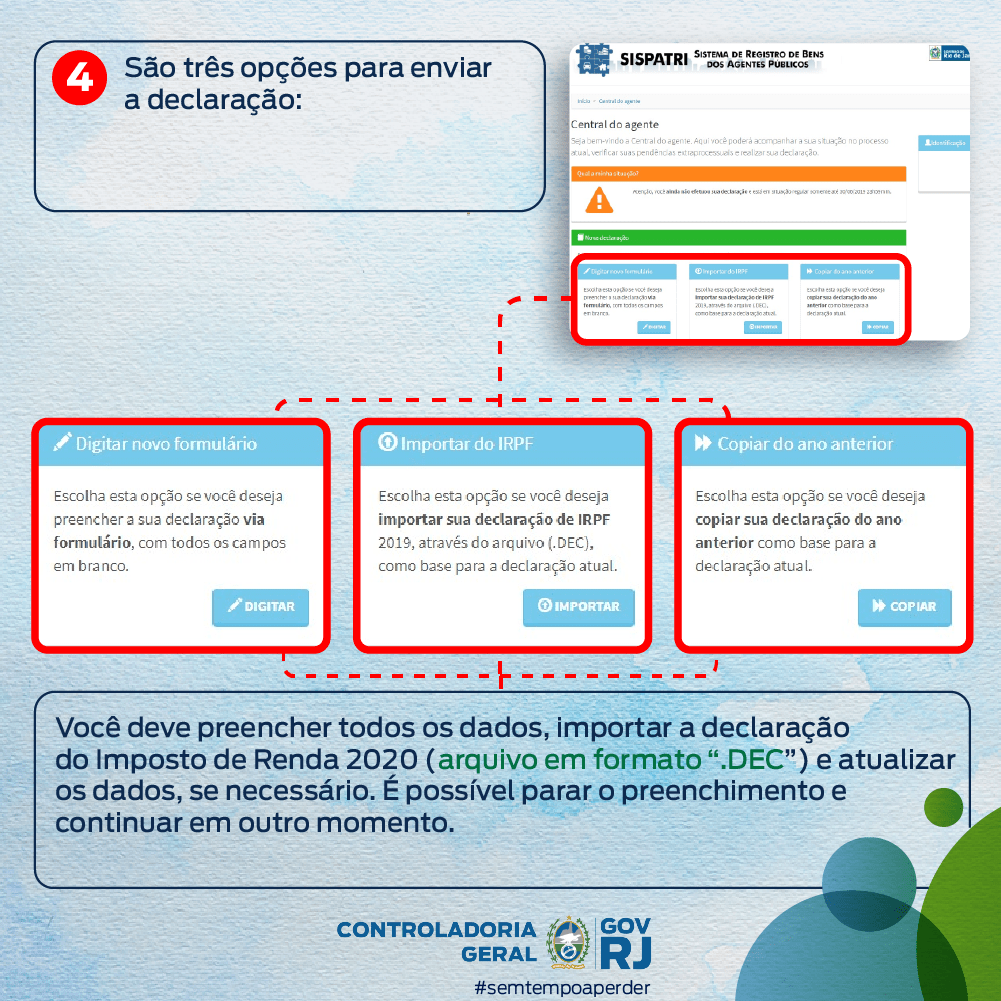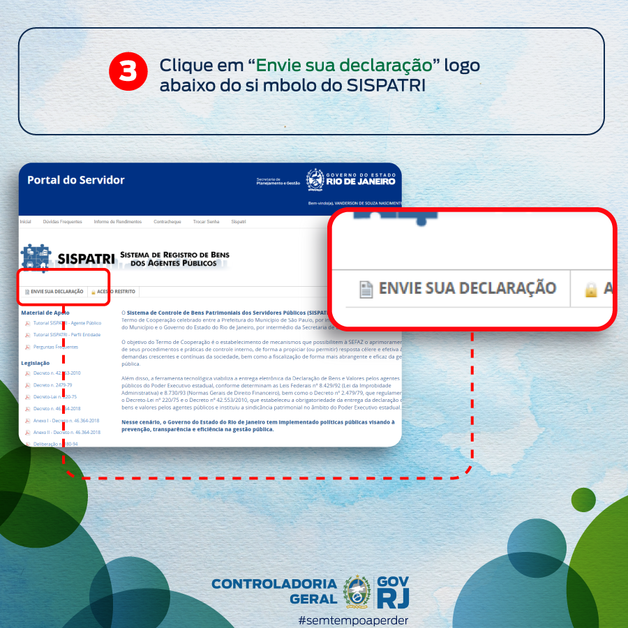 O prazo para o envio das declarações de bens e valores pelo SISPATRI (Sistema de Controle de Bens Patrimoniais dos Agentes Públicos) foi prorrogado para o dia 30 de agosto de 2021. A ampliação do prazo foi publicada no Diário Oficial do Estado do Rio de Janeiro último dia 30 de julho, conforme Decreto nº 47.709. Confira abaixo o passo a passo para a declaração: