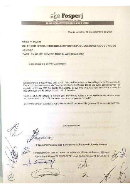 Para conseguir a recepção por parte do Executivo estadual e a consequente entrega do documento, as representações do Fosperj buscaram intermediação junto ao governo entrando em contato com o presidente da Alerj, André Ceciliano, e com o líder do governo, Márcio Pacheco. Os líderes das entidades sindicais e associações de defesa dos trabalhadores que compõem o Fórum ressaltam que estão buscando o diálogo com o Executivo e o Legislativo estadual para expor sua avaliação das regras que foram exigidas para adesão ao RRF, e apontar o quanto os projetos que tramitam na Alerj impactam diretamente a vida dos servidores públicos.