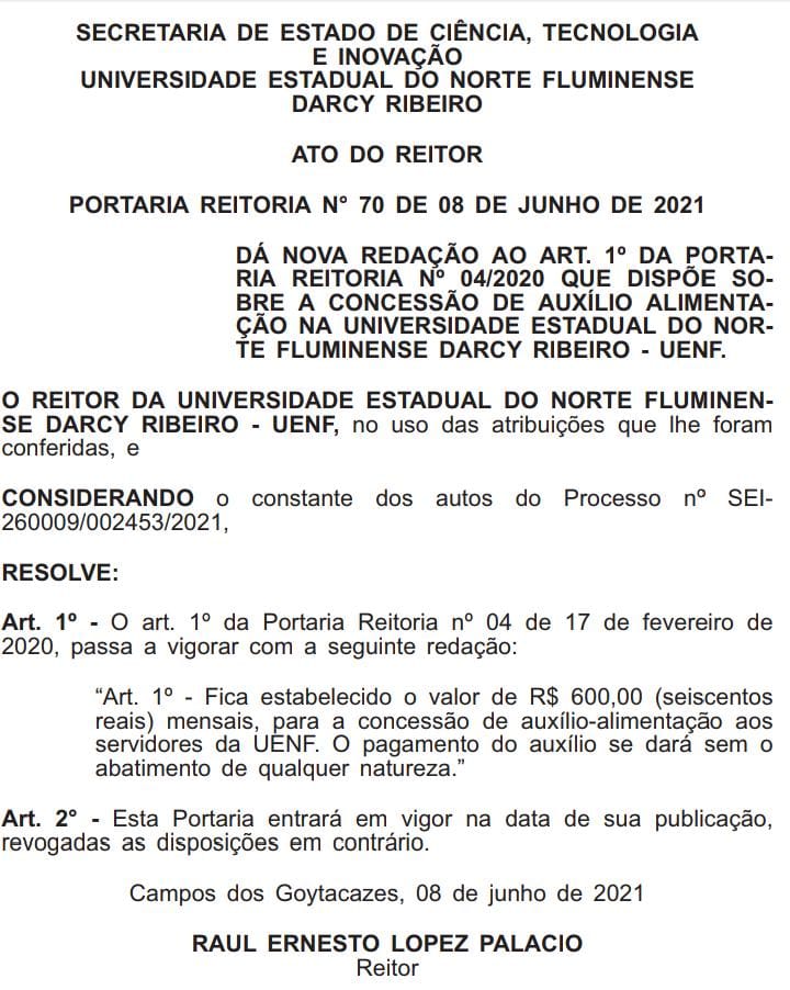 Após o cessamento de descontos indevidos no auxílio alimentação dos técnico-administrativos da Uenf, mais uma conquista envolvendo este direito foi sacramentada. Após demanda apresentada pela categoria nas assembleias e consequente mobilizações da Direção Executiva do Sintuperj junto`a Reitoria da Uenf e ao Legislativo e Executivo estaduais, foi publicado no Diário Oficial desta quarta-feira (09/06) o aumento do auxílio alimentação para R$ 600,00.