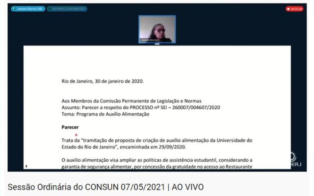 O terceiro processo debatido nesta sessão do Consun foi relativo à proposta de Programa de Auxílio-Alimentação da Uerj voltado para os estudantes cotistas, que teve como relatora a conselheira docente Jeanne Denise Bezerra de Barros. A proposta, aprovada por unanimidade, é uma política de ação afirmativa que visa garantir segurança para os estudantes da Uerj dos ensinos Fundamental e Médio, além dos estudantes de Graduação e Pós-Graduação, que se encontram em situação de dificuldade por conta da pandemia de Covid-19.