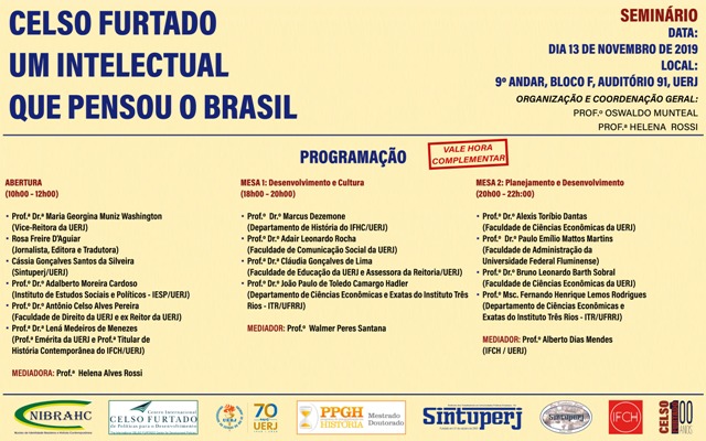 O Nibrahc, Núcleo de Identidade Brasileira e História Contemporânea da UERJ, promove no próximo dia 13/11 o seminário “Celso Furtado: Um intelectual que pensou o Brasil”. O evento, que contará com mesas de debate compostas por grandes nomes do meio acadêmico, é uma homenagem aos 100 anos de nascimento do economista, um dos principais intelectuais do país no século XX.