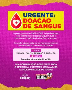 O Fórum Permanente dos Servidores Públicos Estaduais do Rio de Janeiro (Fosperj) está promovendo uma campanha de doação de sangue para o piloto da Polícia Civil atingido por um disparo e que está internado em estado grave, no Hospital Miguel…