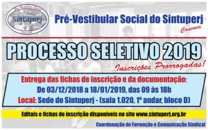 Foi prorrogado o período de inscrições para as vagas do ano de 2019 do Pré-Vestibular Social do Sintuperj. Os candidatos ao projeto poderão se inscrever entre os dias 03/12/2018 e 18/01/2019 para as 300 vagas totais, sendo 150 para o…