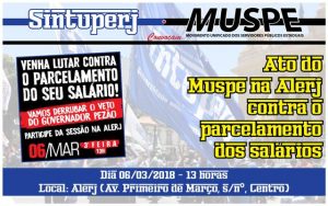 SINTUPERJ CONVOCA: Ato do Muspe na Alerj contra o parcelamento dos salários. Data: Dia 06/03/2018 (terça-feira); Horário: A partir das 13:00h; Local: Alerj (Avenida Primeiro de Março, sem número, Centro); Organização: Muspe – Movimento Unificado dos Servidores Públicos Estaduais RJ.…
