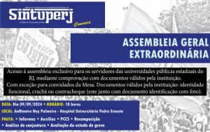 Na última Assembleia dos técnico-administrativos, realizada em 13/08/2024, a Diretoria Executiva do Sintuperj apresentou diversas propostas. Entre elas: 1- Construir a realização de uma plenária comunitária da Uerj, a ser discutida com DCE e Asduerj, para discussão da possibilidade de…