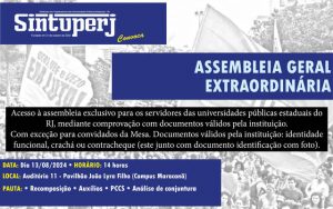 Os técnico-administrativos da Uerj realizarão assembleia no próximo dia 13 de agosto, terça-feira, às 14h, no Auditório 11 do campus Maracanã. Na pauta: Recomposição; Auxílios; PCCS; Análise de conjuntura. O acesso à assembleia será exclusivo para os servidores das…