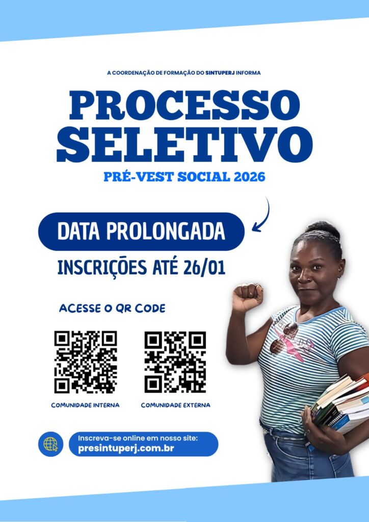Devido aos resultados dos vestibulares que ocorrem a partir do dia 16 de janeiro, as inscrições e matrículas do Pré-vestibular Social do Sintuperj para 2026 foram prorrogadas até o dia 26 de janeiro.
