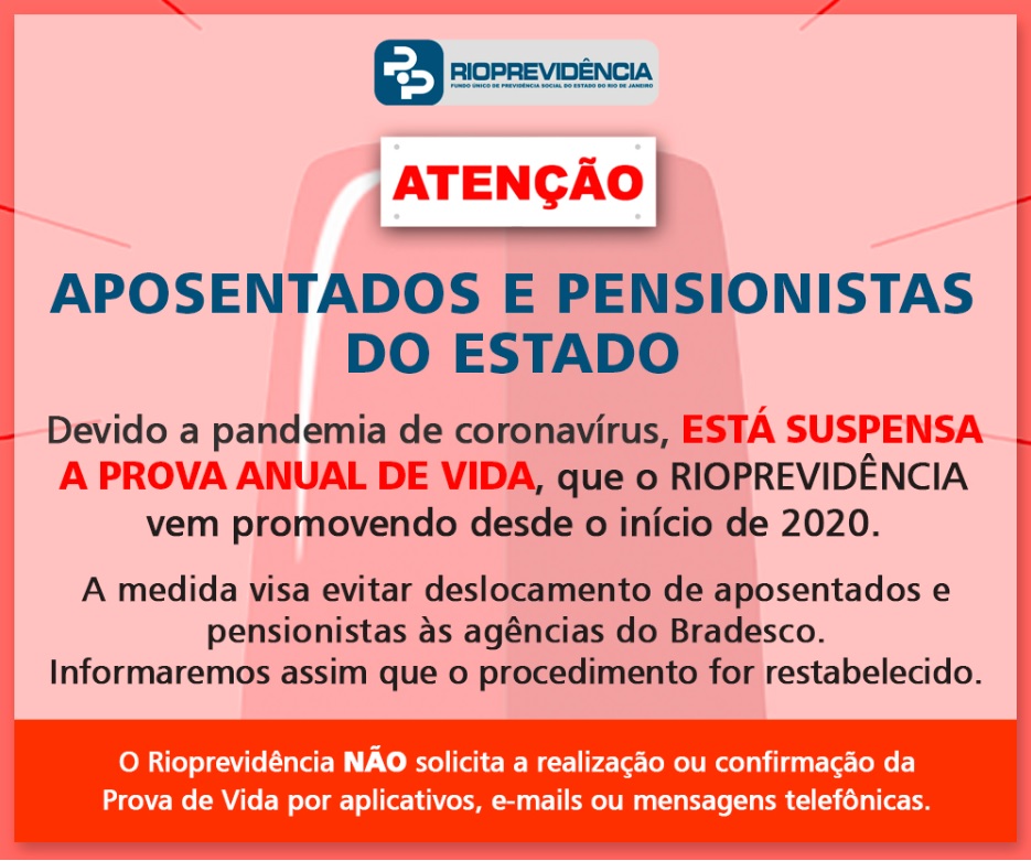 Com vistas a evitar o deslocamento de aposentados e pensionistas durante a pandemia de Covid-19, o RioPrevidencia anunciou em seu site que está suspensa a prova de vida anual. De acordo com o informação, o órgão informará quando o procedimento for retomado.