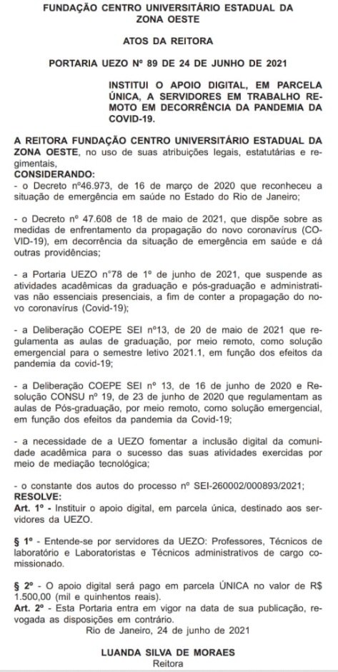 Demanda surgida após o início da pandemia e a necessidade de desenvolver suas atividades laborais em casa (home office), os servidores do Centro Universitário da Zona Oeste (Uezo) terão direito a um auxílio remuneratório visando cobrir a elevação de seus gastos sobretudo com a utilização de serviços de internet.