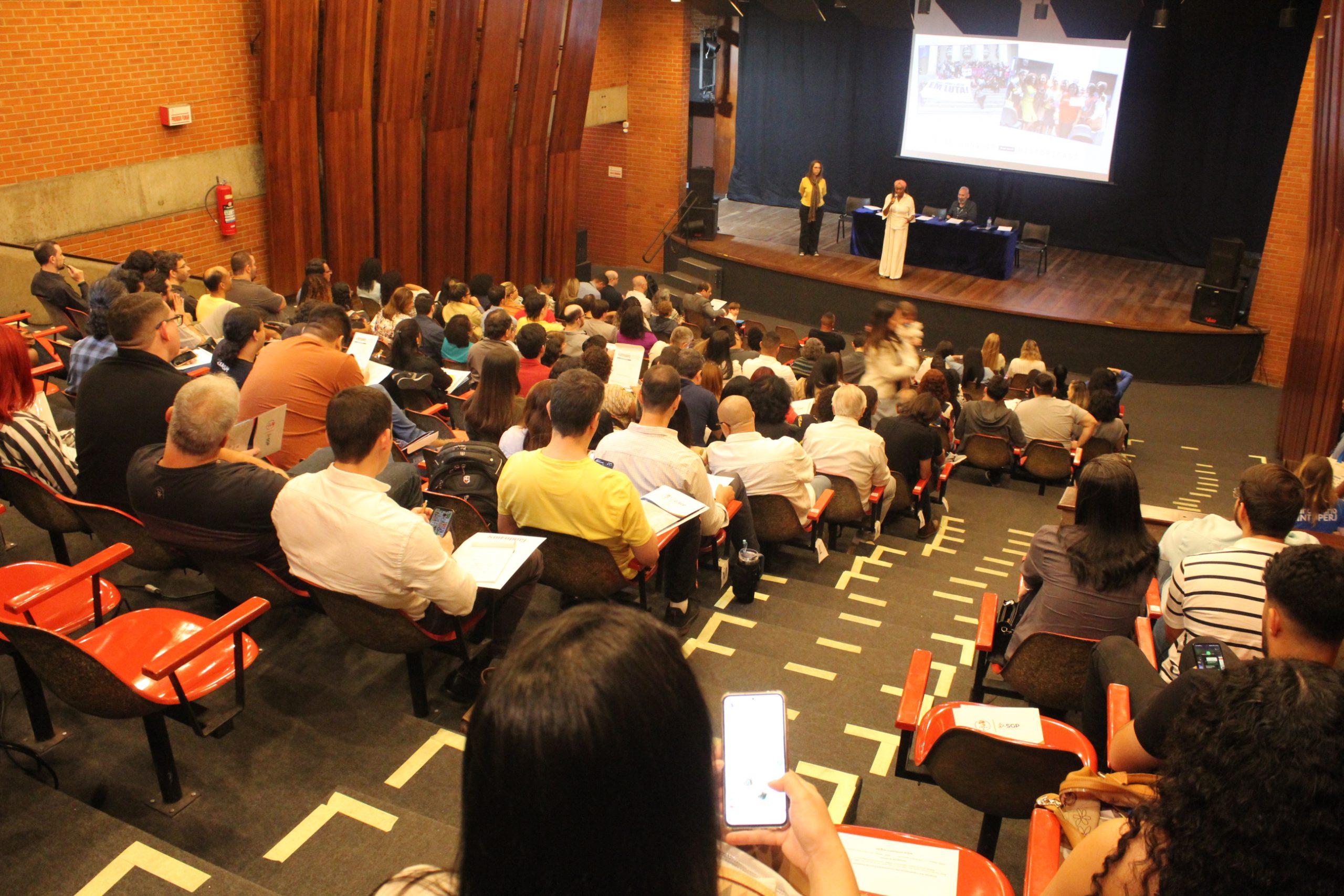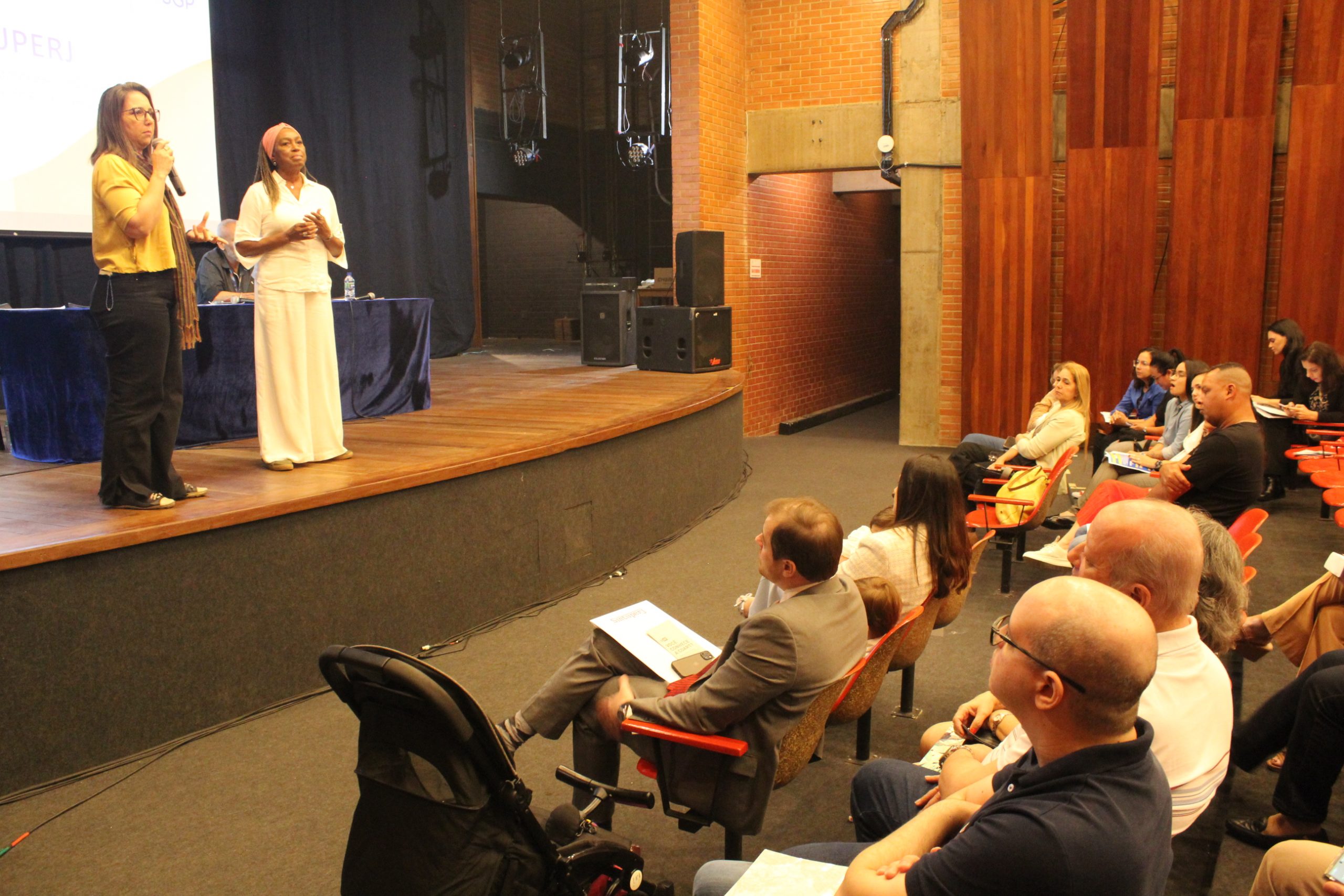 O Teatro Noel Rosa foi palco da cerimônia de posse de técnicos e docentes da Uerj, na última sexta-feira (30/08), durante o Ambiente-se, evento que visa recepcionar novos servidores. Durante a cerimônia a coordenadora geral do Sintuperj Regina de Souza e a coordenadora de Formação e Comunicação Sindical, Bianca Mantovani, fizeram uma saudação em nome do Sindicato dos Trabalhadores das Universidades Públicas Estaduais – Sintuperj.