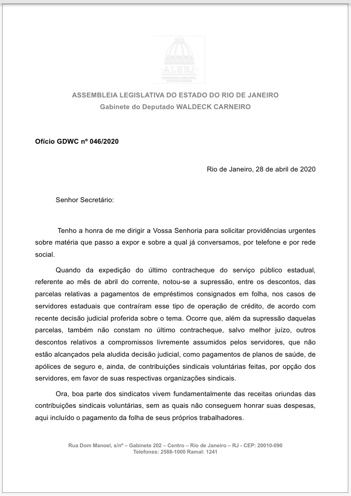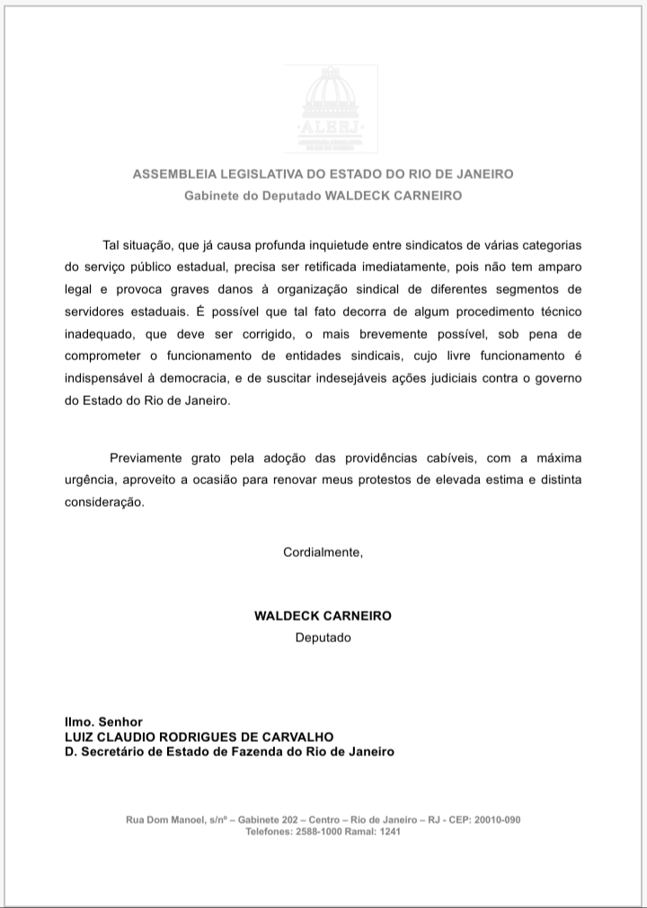 Simultaneamente, a Coordenação Executiva do Sintuperj, em conjunto com o conselheiro universitário e ex-coordenador do sindicato Jorge Luís Mattos (Gaúcho), manteve contato com o deputado estadual Waldeck Carneiro (PT) para uma atuação do Parlamento na resolução do imbróglio. Waldeck enviou comunicação oficial ao secretário de Estado de Fazenda, Luiz Claudio Rodrigues de Carvalho, reiterando a necessidade e urgência na resolução do equívoco referente à ausência dos descontos sindicais voluntários e os problemas sociais daí oriundos. Confira a solicitação parlamentar abaixo: