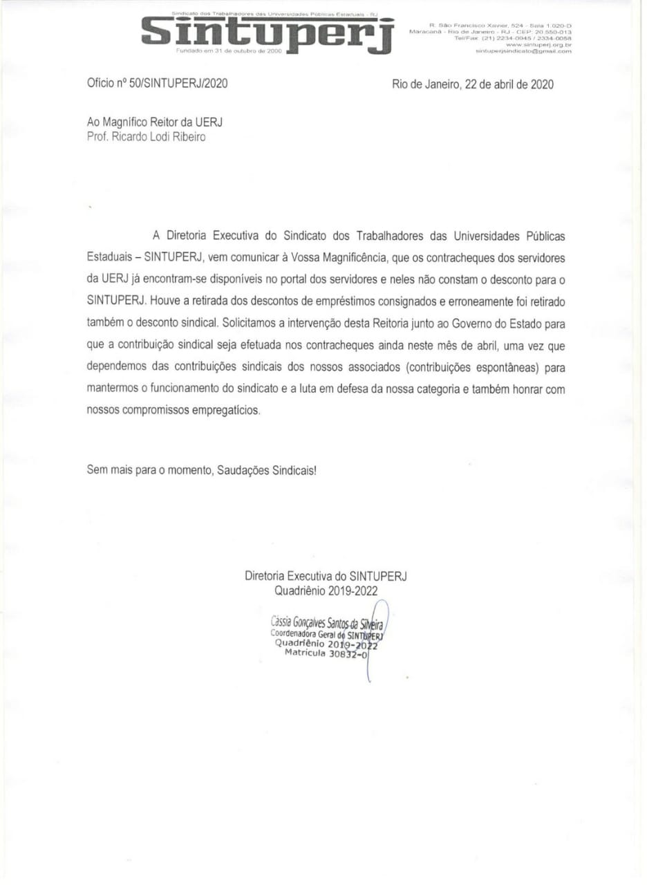 No mesmo dia, o sindicato informou o problema oficialmente ao reitor da Uerj, Ricardo Lodi, e solicitou sua intervenção. Confira o documento abaixo:
