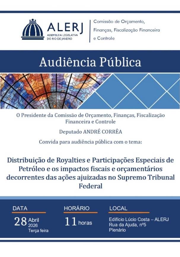 O encontro será realizado na próxima terça-feira, dia 28/04/2026, às 11h, na sede da Alerj, Edifício Lúcio Costa. O endereço é Rua da Ajuda, número 5, Centro da cidade.
