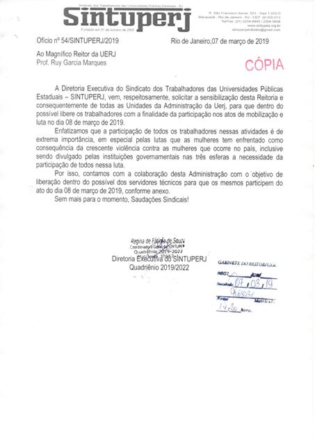 O Sintuperj, através de ofício, solicitou ainda à Reitoria da Uerj que se sensibilize para que, dentro do possível, libere as trabalhadores e os trabalhadores para que possam participar do 8M Rio, que irá marcar as mobilizações do Dia da Mulher no Rio de Janeiro.