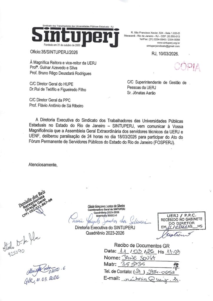 Ainda no dia 11/03, o Sintuperj encaminhou ofício destinado à Reitoria da Uerj, às direções do Hospital Universitário Pedro Ernesto (Hupe) e Policlínica Universitária Piquet Carneiro (PPC) e à Superintendência de Gestão de Pessoas (SGP) informando sobre a paralisação de 24 horas que será realizada no dia 18/03, para que todos os servidores da universidade possam participar do ato organizado pelo Fosperj.