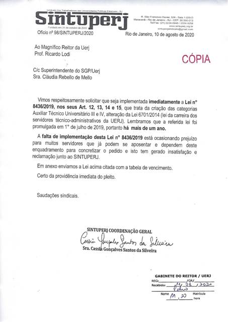 A Diretoria Executiva do Sintuperj encaminhou nesta segunda-feira, 10/08, ofício à Reitoria da Uerj e a Superintendência de Gestão de Pessoas da Universidade (SGP) solicitando que sejam implementados de maneira imediata pela instituição os artigos 12, 13, 14 e 15 da lei número 8.436, sancionada pelo Governo do Estado no dia 01/07/2019. Os referidos artigos criam dois novos padrões na carreira de Auxiliar Técnico Universitário da Uerj (A3 e A4).